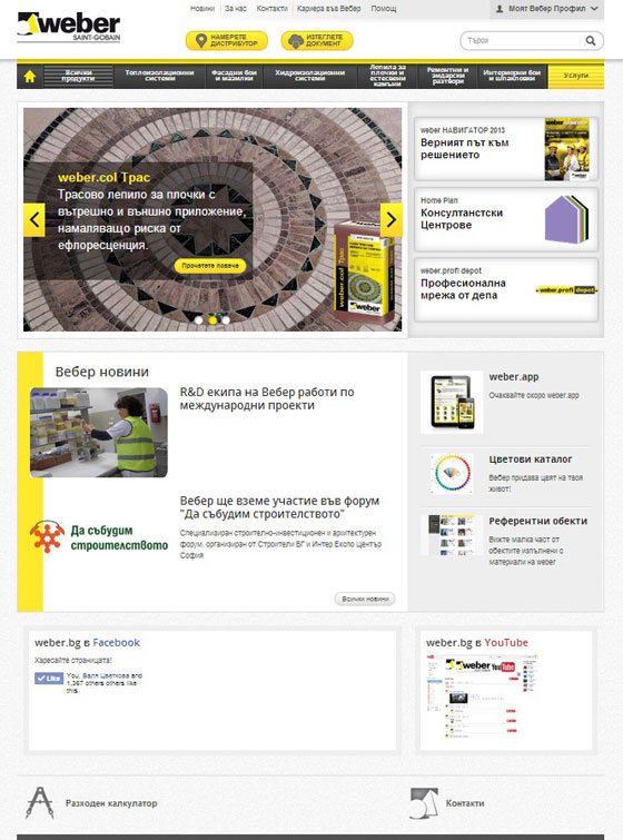 Ще започна оттам, че Вебер България има нов сайт www.weber.bg. Различното в него, освен обновената визия са подобрените функционалности и нови апликации. Основната цел е да се улеснят максимално посетителите на сайта, съкращавайки времето за търсене на информация, както и да се увеличи обемът информация и да се обогатят он-лайн услугите предлагани от компанията – като разходен калкулатор и локализатор в реално време на точките на продажба.