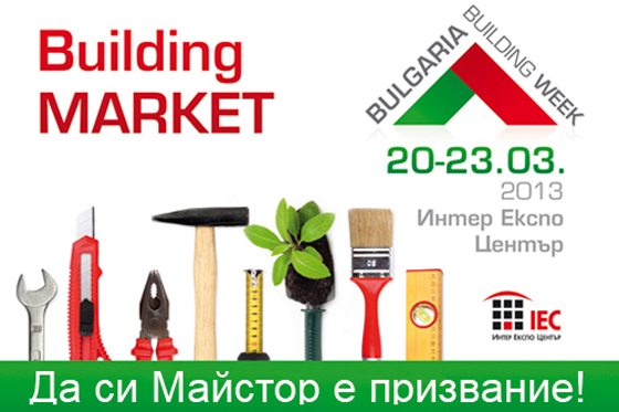 Салон, насочен към крайните клиенти в дните на БЪЛГАРСКА СТРОИТЕЛНА СЕДМИЦА, ще даде решения в строителството, ремонтните дейности, декорацията на дома и градината. При заявяване на участие в салона до края на януари 2013 г. фирмите ползват 20% отстъпка от цената на площта. Майсторът знае най-добре какво, кога и точно колко е нужно, за да бъде ремонта лесен и правилен. Именно Майсторът е този, който избира материалите и препоръчва продуктите. BUILDING MARKET ще представи най-добрите продукти на производители и търговци, ориентирани директно към Майстора във всеки дом. Авторитетният строителен форум, който ще се проведе от 20 до 23 март за 13-ти пореден път в Интер Експо Център – София разширява обхвата на участващите фирми и компании. Със създаването на новия салон BUILDING MARKET изложението ще предложи специализирани съвети във всяко едно звено на строително ремонтните услуги.